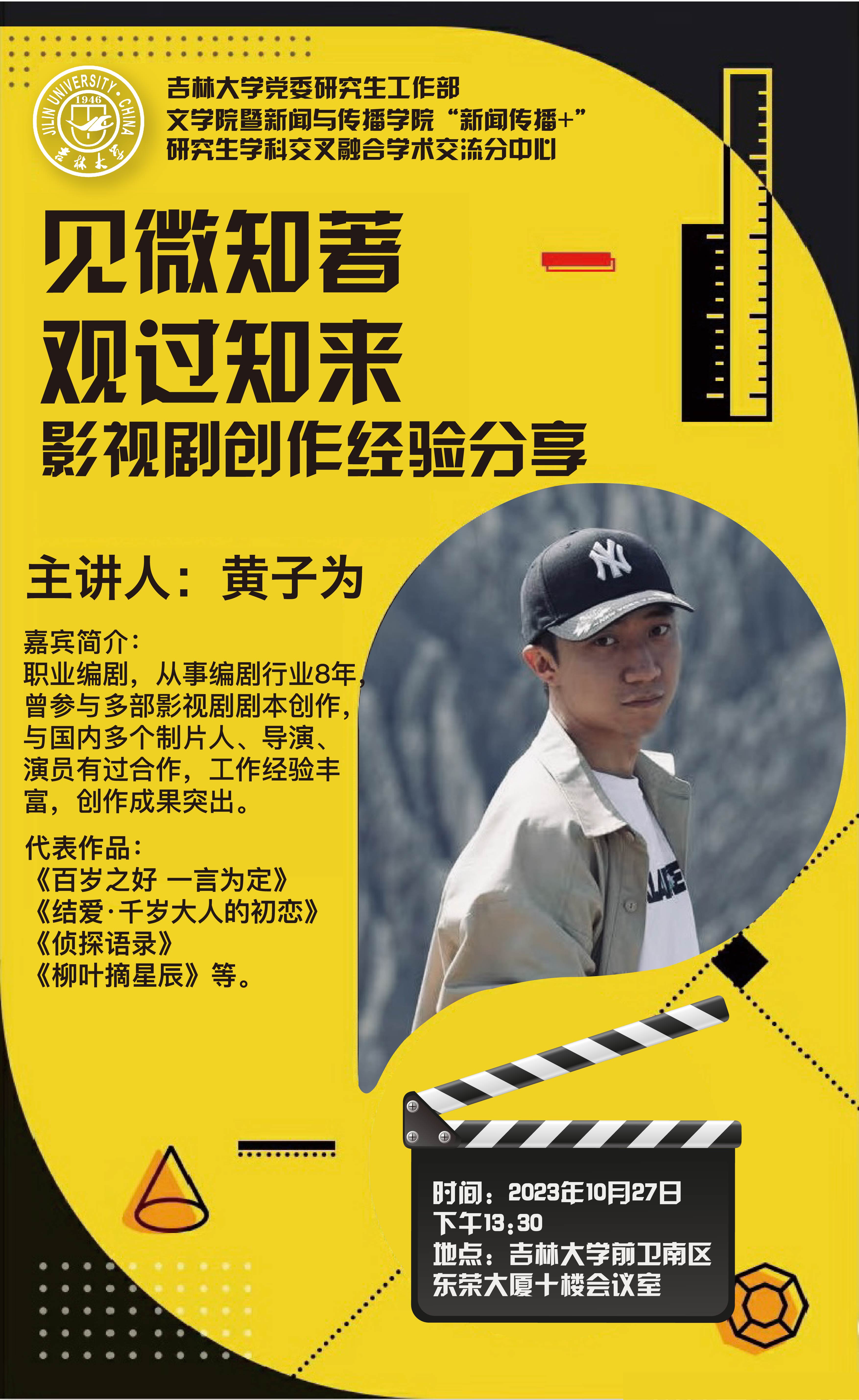 为了加强员工对影视行业工作的理解,深入了解互联网时代影视剧本创作的现状和发展趋势,探寻影视行业剧本创作理念,提升专业素养,提高创新思维能力,中心特邀青年编剧黄子为,分享其多年创作经验与体会。具体事项通知如下: