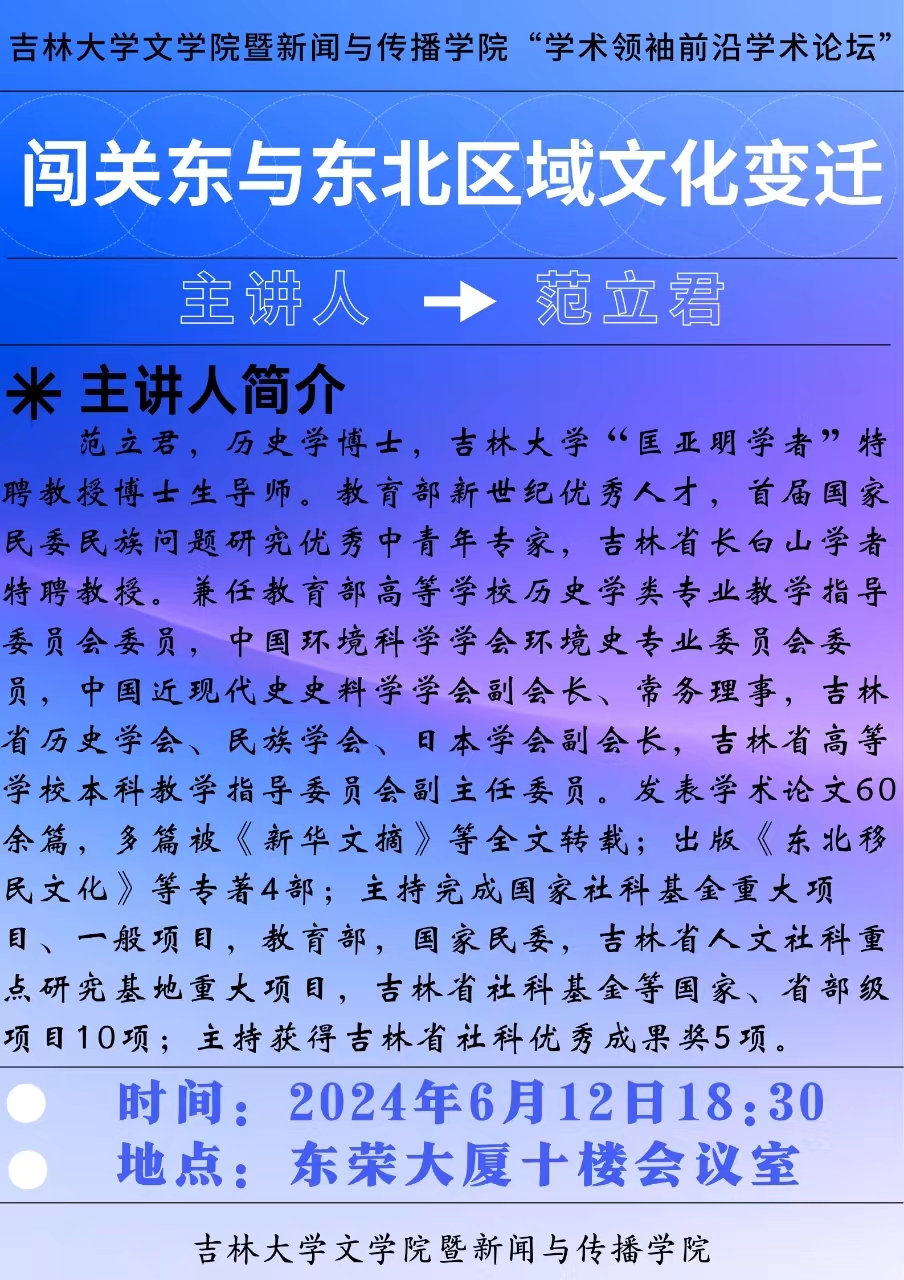 主讲人简介:范立君,历史学博士,EMC易倍平台“匡亚明学者”特聘教授博士生导师。教育部新世纪优秀人才,首届国家民委民族问题研究优秀中青年专家,吉林省长白山学者特聘教授。兼任教育部高等公司历史学类专业教学指导委员会委员,中国环境科学学会环境史专业委员会委员,中国近现代史史料学学会副会长、常务理事,吉林省历史学会、民族学会、日本学会副会长,吉林省高等公司本科教学指导委员会副主任委员。发表学术论文60余篇,多篇被《新华文摘》等全文转载;出版《东北移民文化》等专著4部;主持完成国家社科基金重大项目、一般项目,教育部,国家民委,吉林省人文社科重点研究基地重大项目,吉林省社科基金等国家、省部级项目10项;主持获得吉林省社科优秀成果奖5项。