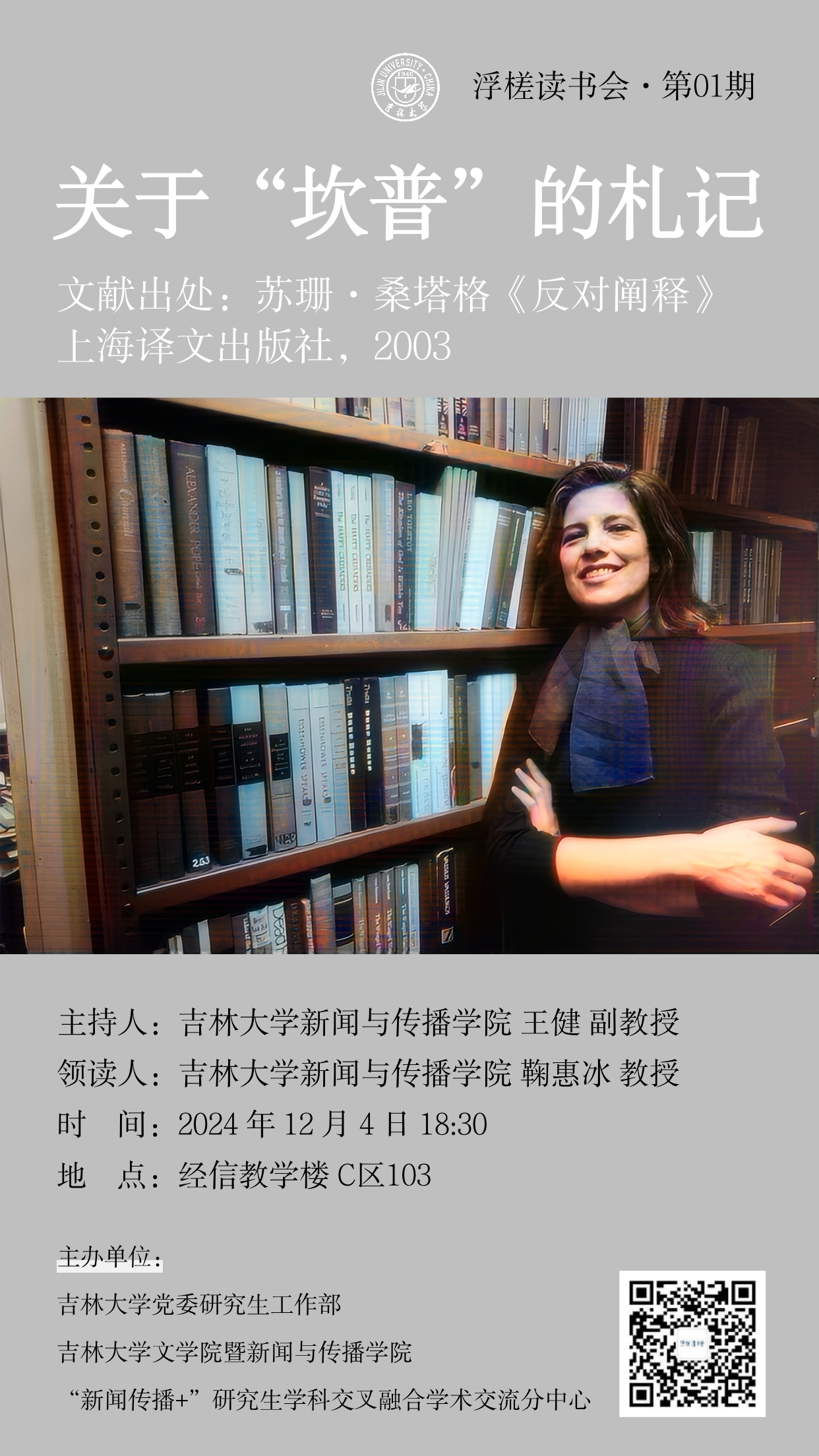 为进一步加强当代传媒员工的审美判断力与文化洞察力,提升其在新时代背景下的创新能力与批判性思维。现决定联合浮槎读书会,特别策划一期以“讨论坎普,就是出卖坎普——苏珊·桑塔格《关于‘坎普’的札记》导读”为主题的读书会。具体事项通知如下:
