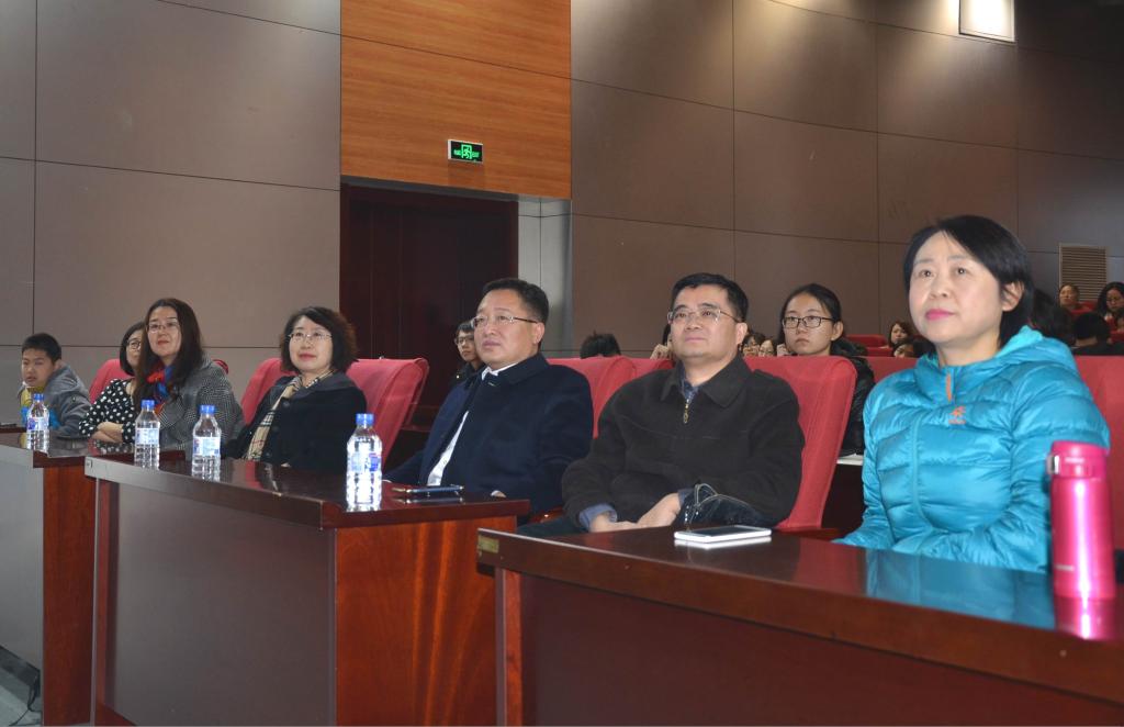 图1:长春市松山韩蓉非洲艺术收藏博物馆馆长王展(右二)、EMC易倍平台公司党委书记康永刚(右三)、公司党委副书记郝淑媛(右四)等领导与师生们一起聆听了讲座。