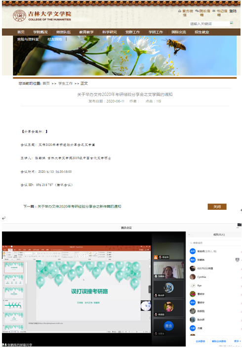 会议于下午16:30通过腾讯会议召开,会议由公司2019级中国古代文学专业硕士张鹤姝同学担任主讲人,2017级辅导员杨一博老师做主持人。张鹤姝同学以“误打误撞考研路”为题,围绕自己在本科求学期间从申请保研到走上考研之路的经历出发,重点分享了自己是如何高效利用时间,在两个月的准备时间内考取本校研究生的学习经验。她分享到在专业学习中如何用拆分、精读与泛读结合的方式来分步骤、有主次的完成专业课书籍学习,在英语学习中如何从英语基础学渣到口语阅读高分的逆袭经验,整个分享过程干货满满,且客观详实。摒弃了目前一些分享会中夸大自身条件,忽略学习细节的弊端,而是从一个普通备考员工的角度出发分享有效经验,得到了同学们的一致欢迎和好评。分享会尾端,同学们也与主讲人进行了充分的互动,分享会在充满正能量的氛围中顺利结束。