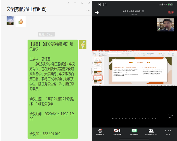 会议于下午16:30通过腾讯会议召开,由公司2015级人文科学试验班专业郭轩瑾同学担任主讲人,2017级辅导员杨一博老师作主持人。杨老师首先向同学们介绍了郭轩瑾同学的基本履历。会议开始后,郭轩瑾同学围绕“保研?出国?我的选择”这一主题向大家介绍了自己从放弃保研到出国求学的心路历程,并从亲身经历出发,和与会同学重点分享了自己在出国留学准备中的经验,涵盖择校、材料准备、心态准备、环境综合考量等各个方面,同时贯穿了自己在每一步经历中的人生选择。郭轩瑾同学通过不断跳出自己的舒适圈,挑战自我,同时发现自己的学术兴趣点,到目前决定致力于妇女和儿童保障工作,积极参与到国际组织中为正义发声,展现了当代有担当的“后浪”群像。最后,同学们在评论区与主讲人进行提问互动,2017级辅导员杨一博老师也针对人生选择和出国留学过程中的注意事项为大家提出建议,分享会在同学们受益匪浅的反馈中圆满结束。