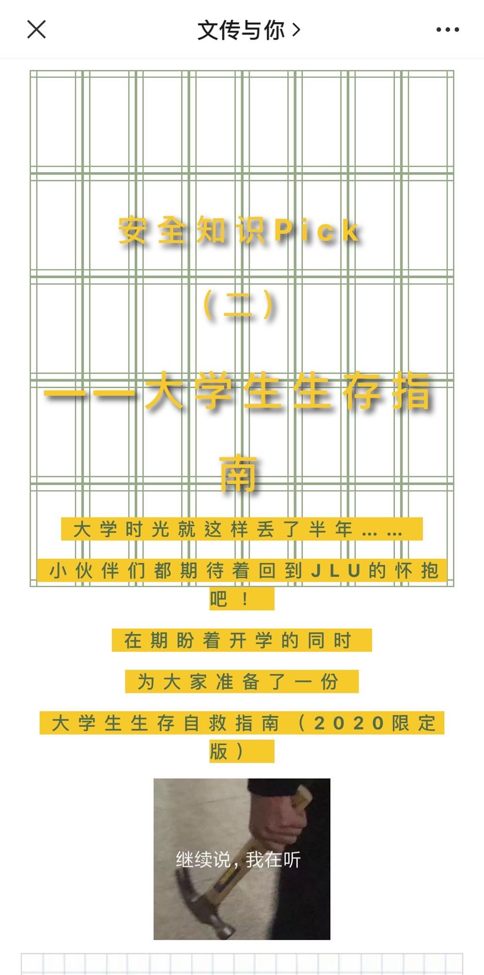 科普活动对国家安全生产月的发展历程、开展意义和校园安全的主题、目标、主要内容等进行详细介绍,并投放安全反馈问卷收集同学们关于校园安全的意见与建议。推文活动第二期结合疫情特殊背景,对校园安全几个重点问题进行梳理,包括食品安全、消防安全、交通安全及防疫安全。为获得更好的宣传效果,推送写作采取同学们更喜闻乐见的形式,用轻松的笔触使同学们更易接受、记牢安全知识。