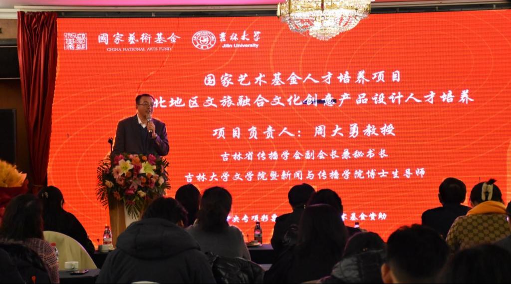 项目负责人吉林省传播学会副会长兼秘书长、EMC易倍暨新闻与传播公司博士生导师周大勇教授向各位嘉宾与学员全面地介绍了项目的立项与实施进程,指出项目厚植于东北文化沃土,挖掘红色文化、非遗文化、殖民文化、汽车文化、长影文化、雕塑文化、冰雪文化等东北独具特色的优秀文化资源,注重东北文化的提炼、组合与转化,依托“文旅融合”发展,激发学员对东北文化的认知与领悟,并通过创意与设计,将东北文化元素融入文创产品,培养高端文化创意产品设计人才,探寻东北文化资源多元化呈现的路径。同时,希望学员们能够抓住这次机会,提升自身艺术文化素养,通过文化先行助力东北振兴。