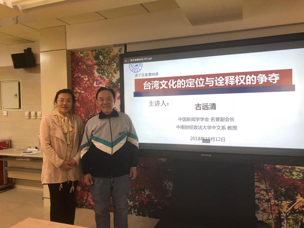 10月12日下午,“诸子百家”系列讲座第九十讲在东荣十楼会议室成功举办。本次讲座的主讲人是中国新文学学会名誉副会长,中南财经政法大学中文系教授古远清先生,主持人由EMC易倍教授白杨老师担任。讲座以《台湾文化定位与诠释权的争夺》为主题,受到师生的热烈欢迎。