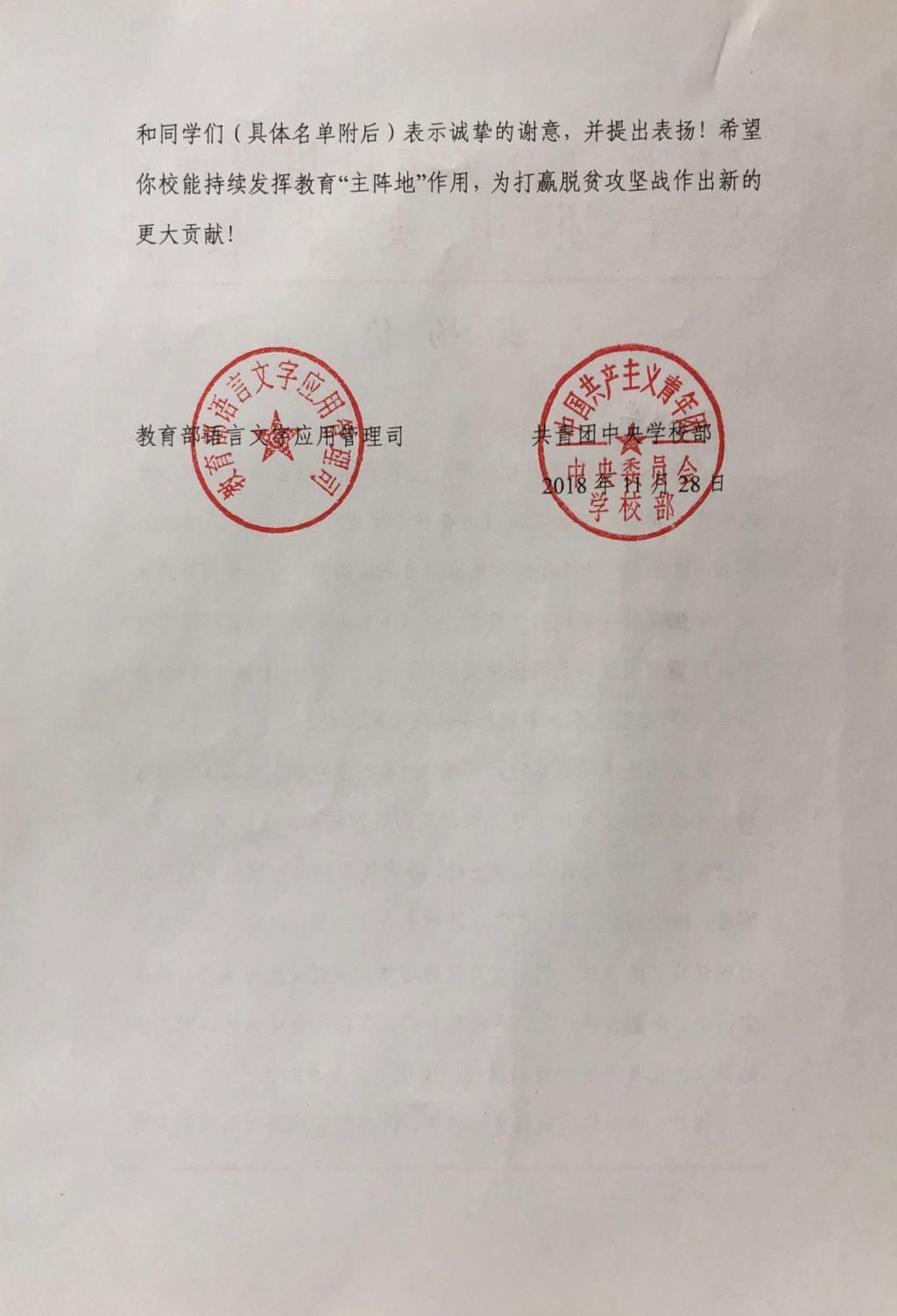 11月28日,经团队报送材料,“‘言传边疆 筑梦中国’EMC易倍平台助力新疆库尔勒市推普脱贫攻坚主题社会实践团队”获评为优秀团队,受到教育部语言文字应用管理司和团中央公司部的表扬。EMC易倍团委定将以此为激励,继续在引导青年、志愿服务等方面发挥示范作用,成为帮助青年员工成长的优秀平台。