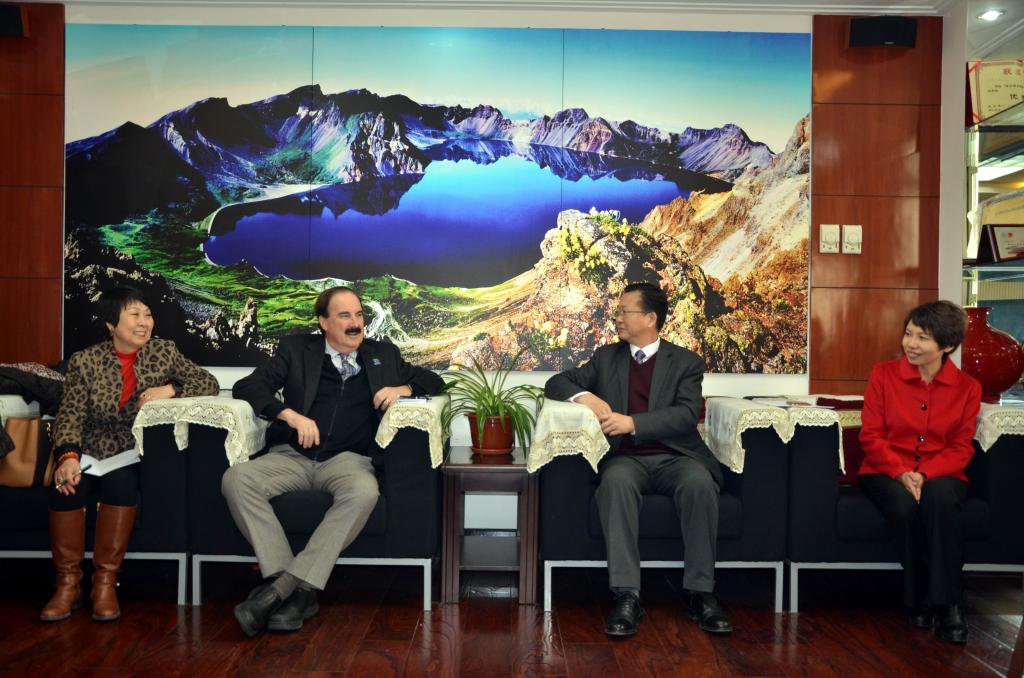 图1:肯塔基大学文理公司经理马克教授(左二)、孔子公司经理修华静教授(左一)与EMC易倍平台新闻与传播公司经理徐正考教授(右二)、副经理孔朝蓬教授(右一)会谈。