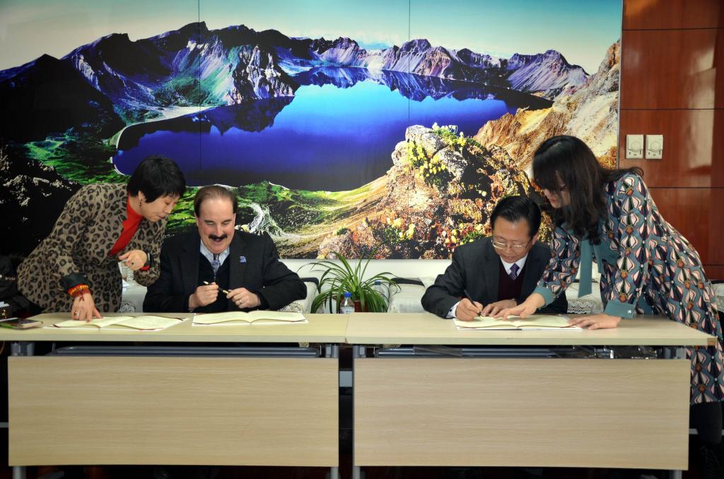 图2:马克经理(左二)与徐正考经理(右二)签署肯塔基大学文理公司与EMC易倍合作意向书。