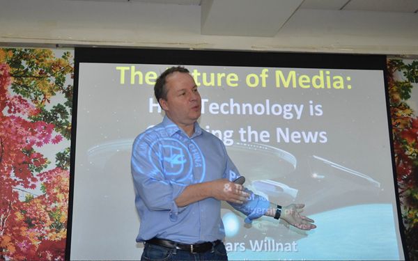 月20日上午,拉尔斯•威尔耐特教授为公司师生作了题为《媒体未来:技术如何改变着新闻》的讲座。讲座主要集中探讨了新技术如何影响娱乐媒体,以及新闻生产与消费。威尔耐特教授的报告主要包括三个部分。首先,基于当前美国的研究样本,他探讨了传统大众传媒的商业模式如何被因特网所破坏,以及这些“旧”媒介如何努力去适应“新”网络环境。随后,威尔耐特教授与在场的师生一同审视了在过去的几年里媒体消费如何变化,以及这些变化在美国如何影响传统媒体与网络媒体。最后,威尔耐特教授详细讨论了新的媒体技术,如无人机、社交媒体的应用技术、虚拟现实报道技术等如何影响现代新闻实践。