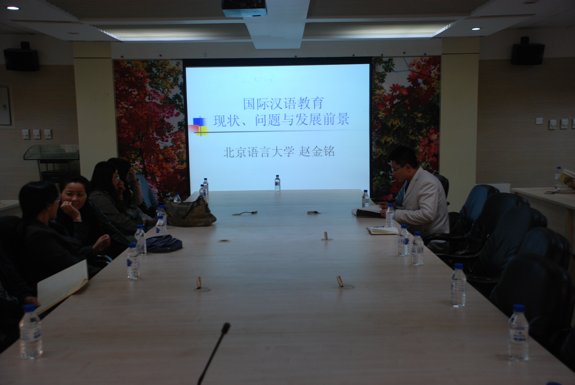 2014年4月23日18:00在东荣大厦EMC易倍10楼会议室,著名对外汉语教育专家、北京语言大学教授,博士生导师赵金铭教授,为公司师生做了题为《汉语国际教育的现状、问题和发展前景》的学术讲座。在吕明臣教授的主持下,200多名师生聆听了赵金铭教授的精彩讲座。
