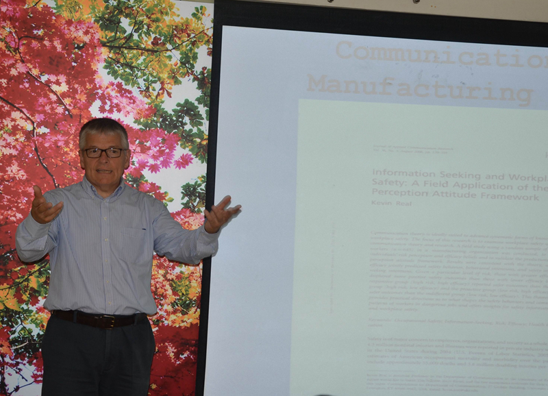 7月1日,凯文•里尔副教授做了题为《利用传播科学改善职业安全与健康》的讲座,凯文•里尔副教授介绍了他曾经从事过的在制造业与医疗保健业这两个行业背景下测量个体风险感知(individual risk perceptions)与自我效能信念(efficacy beliefs)的两项科学研究,提出了风险感知态度框架(RPA),在这个框架里,所感知的风险对自我保护动机(self-protection motivations)的影响因个人效能信念的不同而有所差异。凯文•里尔副教授还现场回答了公司师生提出的相关问题。