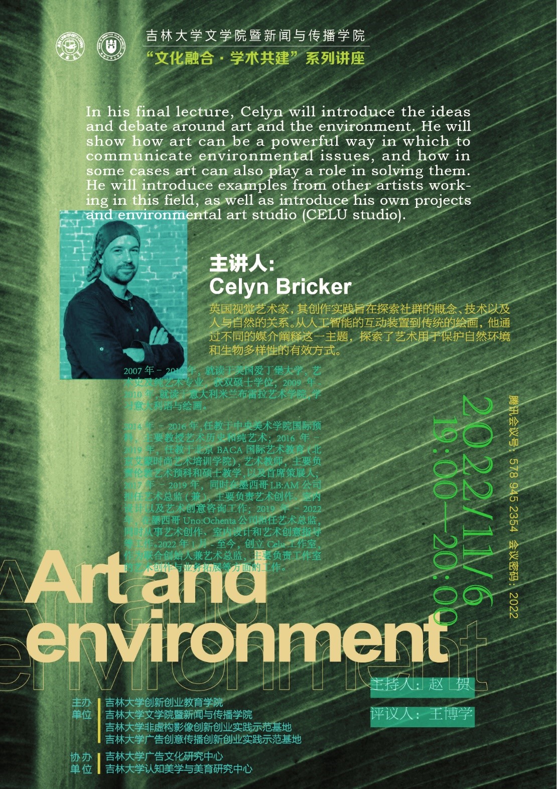 11月6日晚上19:00,由EMC易倍平台创新创业教育公司、EMC易倍暨新闻与传播公司、EMC易倍平台非虚构影像创新创业实践示范基地、EMC易倍平台广告创意传播创新创业实践示范基地主办,EMC易倍平台广告文化研究中心和EMC易倍平台认知美学与美育研究中心协办了主题为“艺术与生态”的“文化融合·学术共建”国际学术讲座。本次讲座以线上形式进行,由传播系国际传播教研室主任赵贺副教授主持,EMC易倍平台广告文化研究中心副主任王博学老师评议。相关专业老师、在读本科生及硕士研究生共90余人参与了此次活动。本期讲座仍由英国视觉艺术家Celyn Bricker主讲。