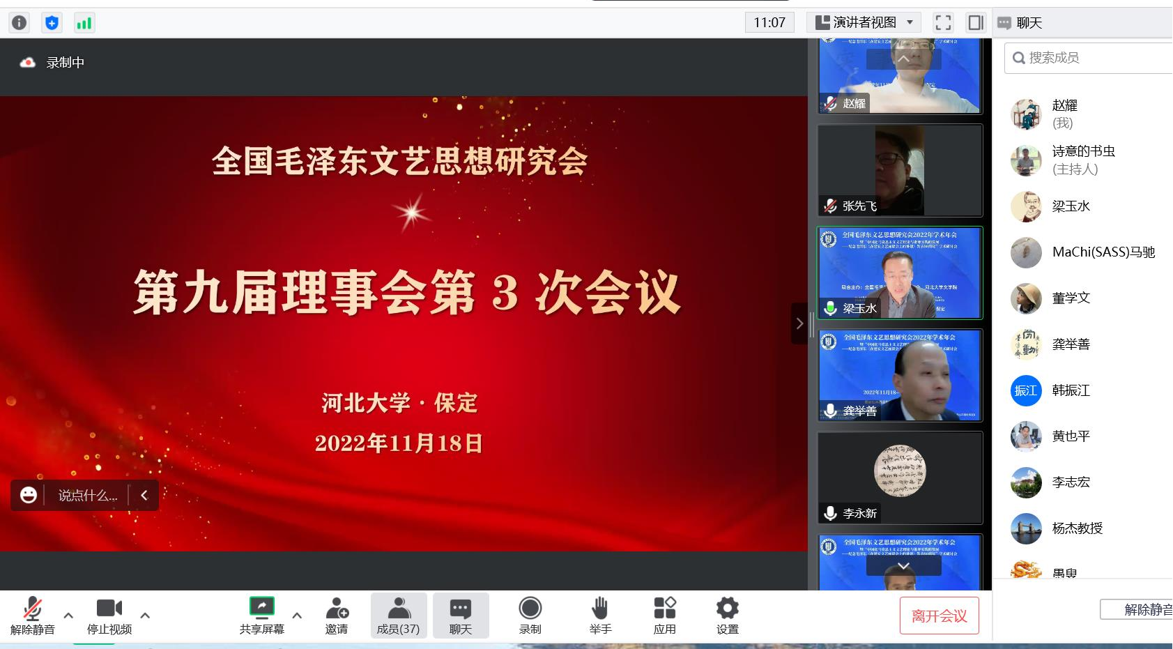 会议期间还召开了第九届理事会第三次会议,理事会设置第一议题,副会长、秘书长梁玉水同志结合党的二十大精神和中国化马克思主义文艺理论与批评实践发展开展了微党课,理事会还就社团建设及学术研究等事项进行了讨论、审议。理事会认为,研究会及广大学界同仁要深入学习党的二十大精神,坚持以习近平新时代中国特色社会主义思想为指导,将党的二十大精神贯彻贯穿到学术组织与研究中,根据中宣部、教育部、民政部、全国哲学社会科学规划办公室等相关部门的具体工作要求,充分发挥教育部重点联系范围的社科学术社团开展有组织的学术研究和学术交流活动的平台功能,推动马克思主义文艺理论与批评实践的中国化时代化进程,使社团成为中国特色社会主义文艺理论与批评自主知识体系建设和实践的有影响力的学术组织单位、咨政服务智库和青年人才培养摇篮,为中国特色社会主义文化、文艺事业的繁荣发展贡献力量。