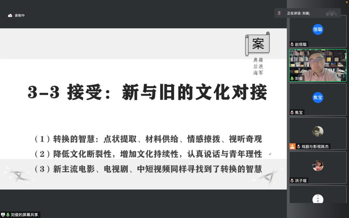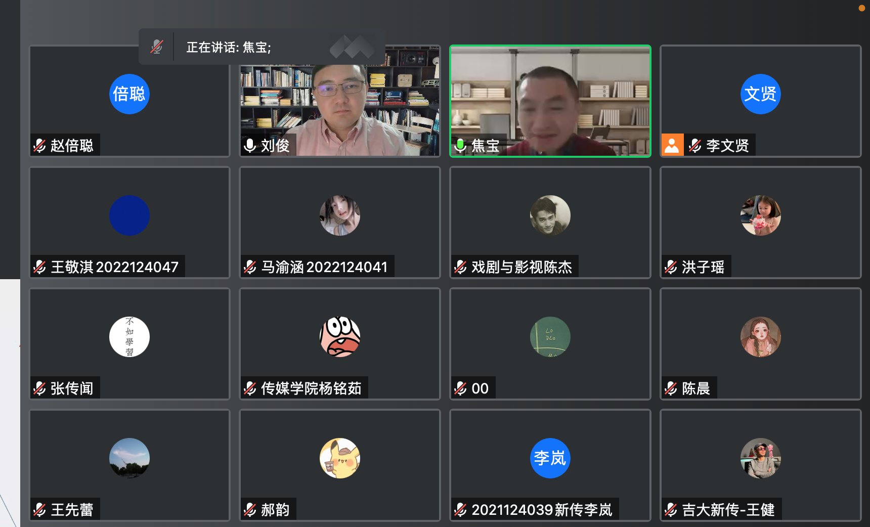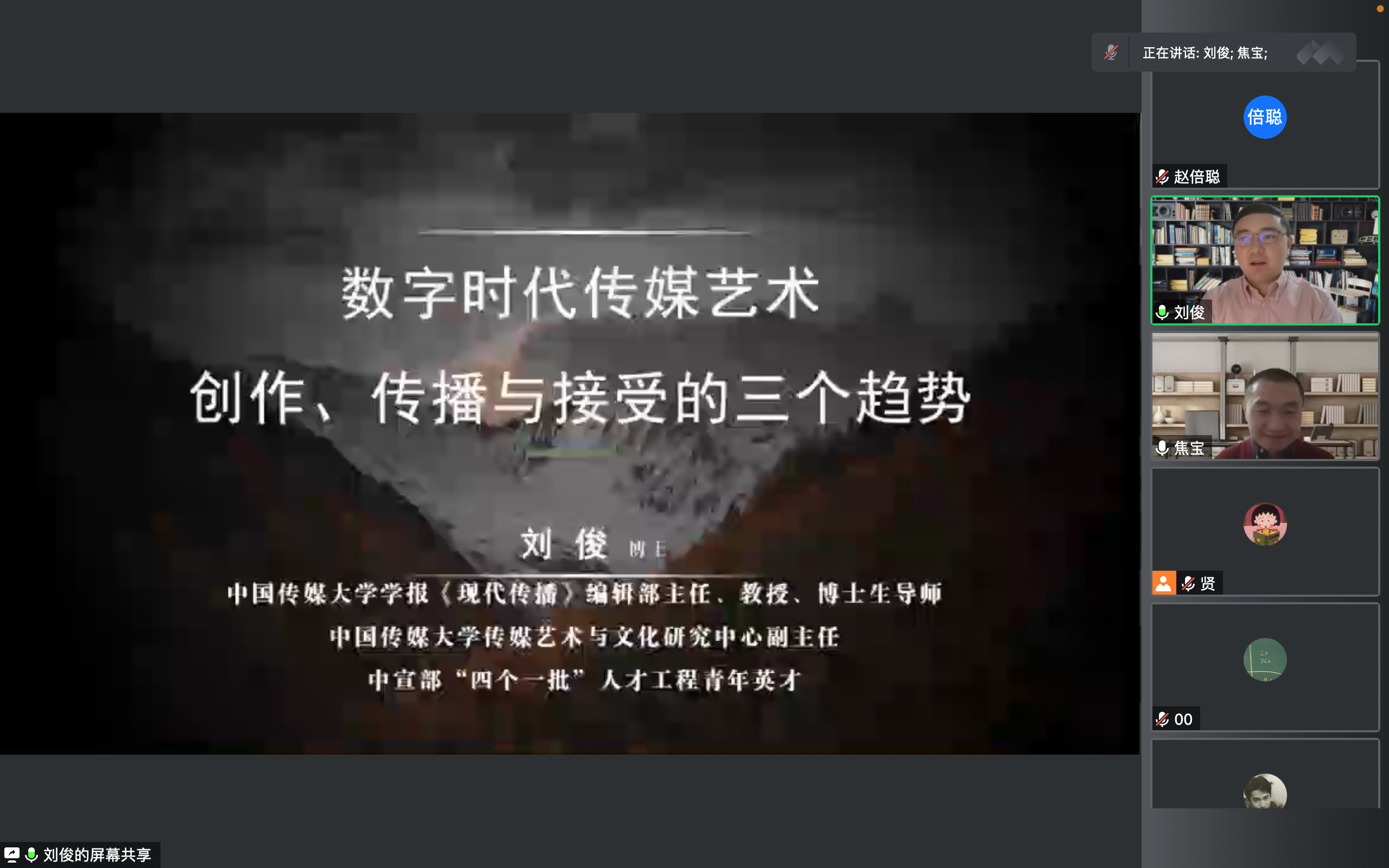 2022年12月1日,为深入学习数字媒体时代传媒艺术发展新趋势,促进各专业研究生学术交流与融合,提高学术创新能力。EMC易倍平台党委研究生工作部、EMC易倍暨新闻与传播公司、“新闻传播+”研究生学科交叉融合学术交流分中心以线上讲座的形式,特邀中国传媒大学教授、博士生导师刘俊。以“数字时代传媒艺术创作、传播与接受的三个趋势”为题,为各专业研究生进行了深入讲解,推动了各学科间的相互交流。新闻与传播公司焦宝老师、姜明老师参与本次讲座。新闻传播学、马克思主义理论、文学、史学、管理学、考古学等专业同学聆听本次讲座。
