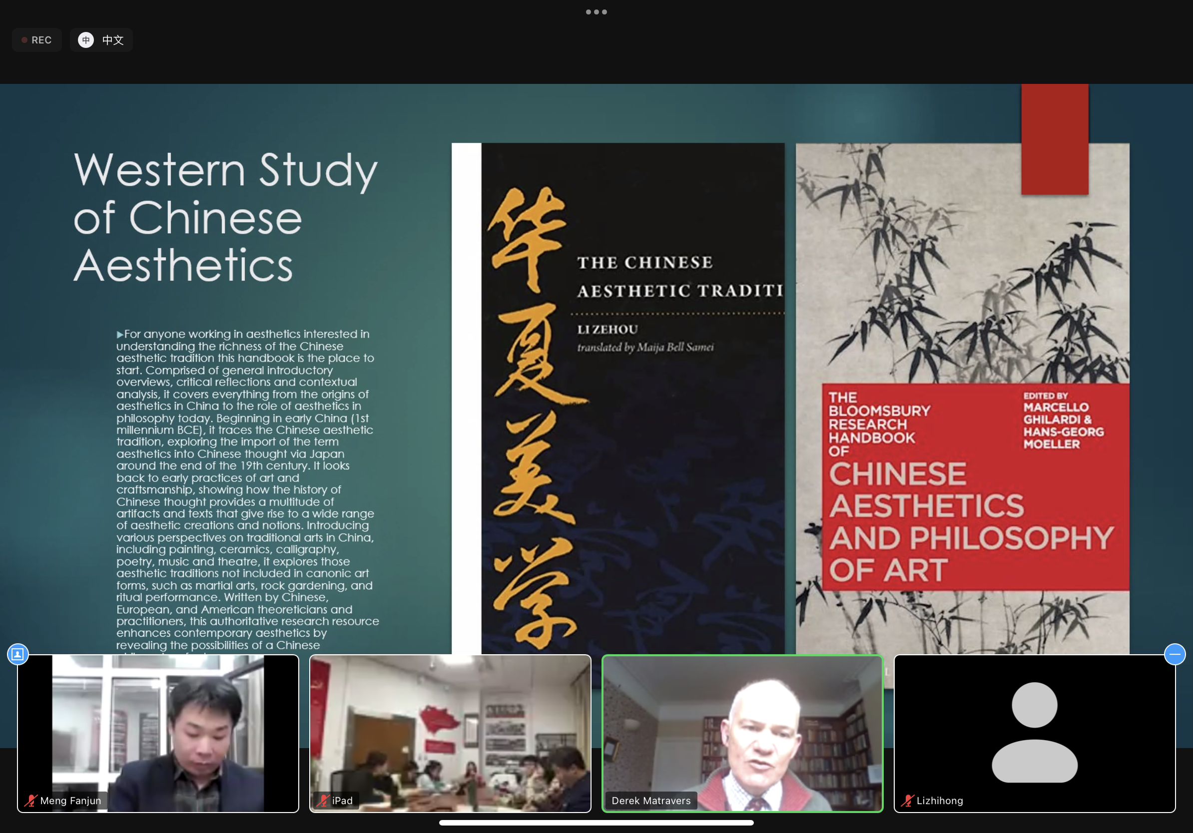 Derek Matervers教授首先从西方哲学“分析哲学”和“大陆哲学”的两个传统引入,回顾了分析美学的近代发展。纵向上,他从分析美学诞生的奠基人G. E. 摩尔到五六十年代战后时期所产生的分化进行了梳理;横向上,从审美判断和批评哲学这两个层面进行了归纳出分析美学的核心议题。其次,Derek Matervers教授按照主题归纳出《英国美学杂志》近年来的发稿的类型,这些为老师和同学们以后的写作或了解分析美学的研究动态非常有帮助。接下来,Derek Matervers教授分享了美学近景中的热点问题:环境美学、文化美学、政治美学和比较美学。最后,Derek Matervers教授为老师和同学们提出了非常重要的论文写作建议,对于中西比较美学方向,以及师生们的日常写作具有重要的借鉴意义。最后,Derek Matervers教授表达了对未来美学发展的光明前景的确信,并期待着日后与EMC易倍平台进行更多的学术交流。