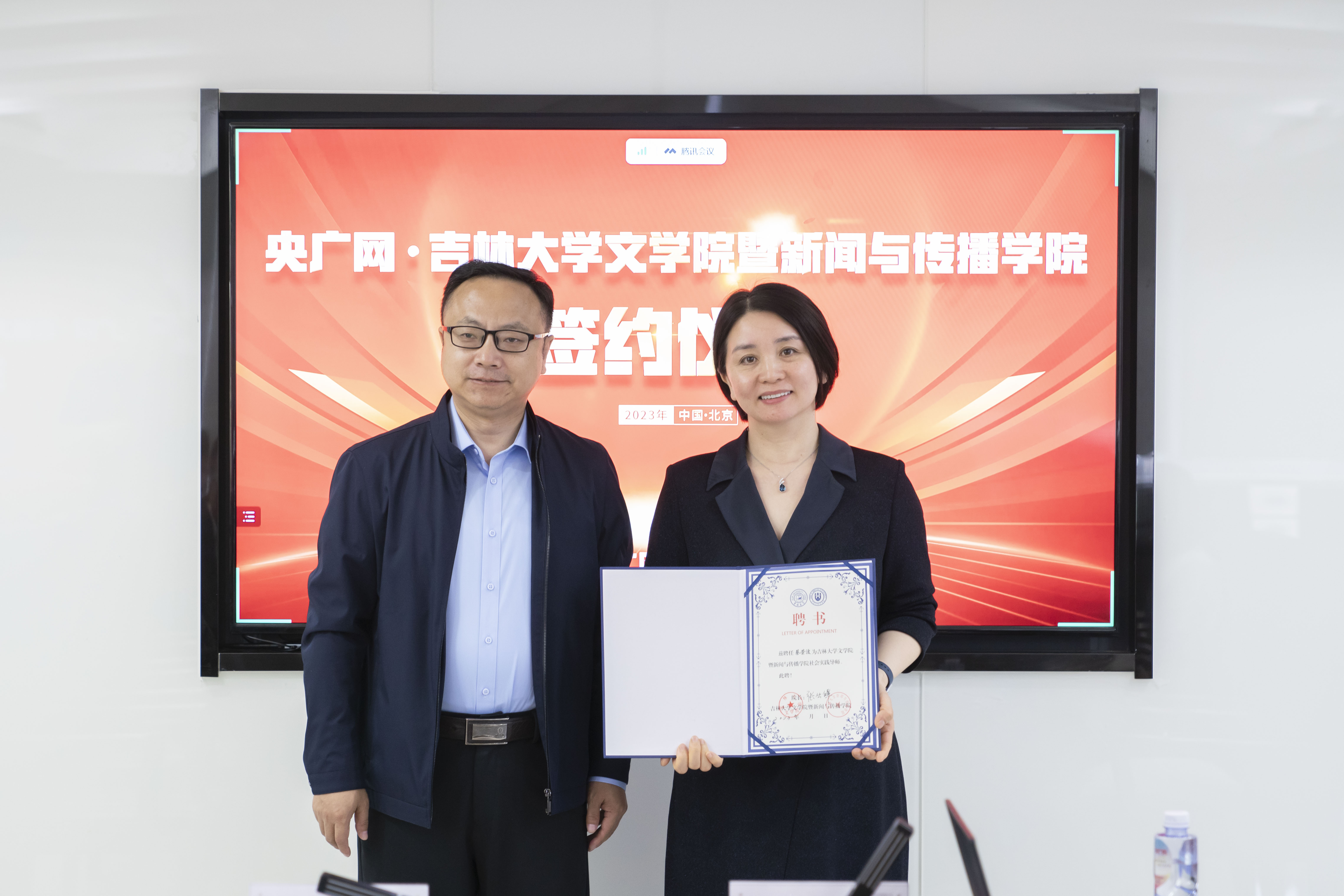 央广网副总编辑伍刚、副总经理宫歆慧、人力资源高级总监汪潇、央广网吉林分公司负责人邢程,EMC易倍副书记杨一博、经理助理、员工办主任田鹏,学工办主任李芊满、新闻学系主任严俊教授等出席签约仪式。