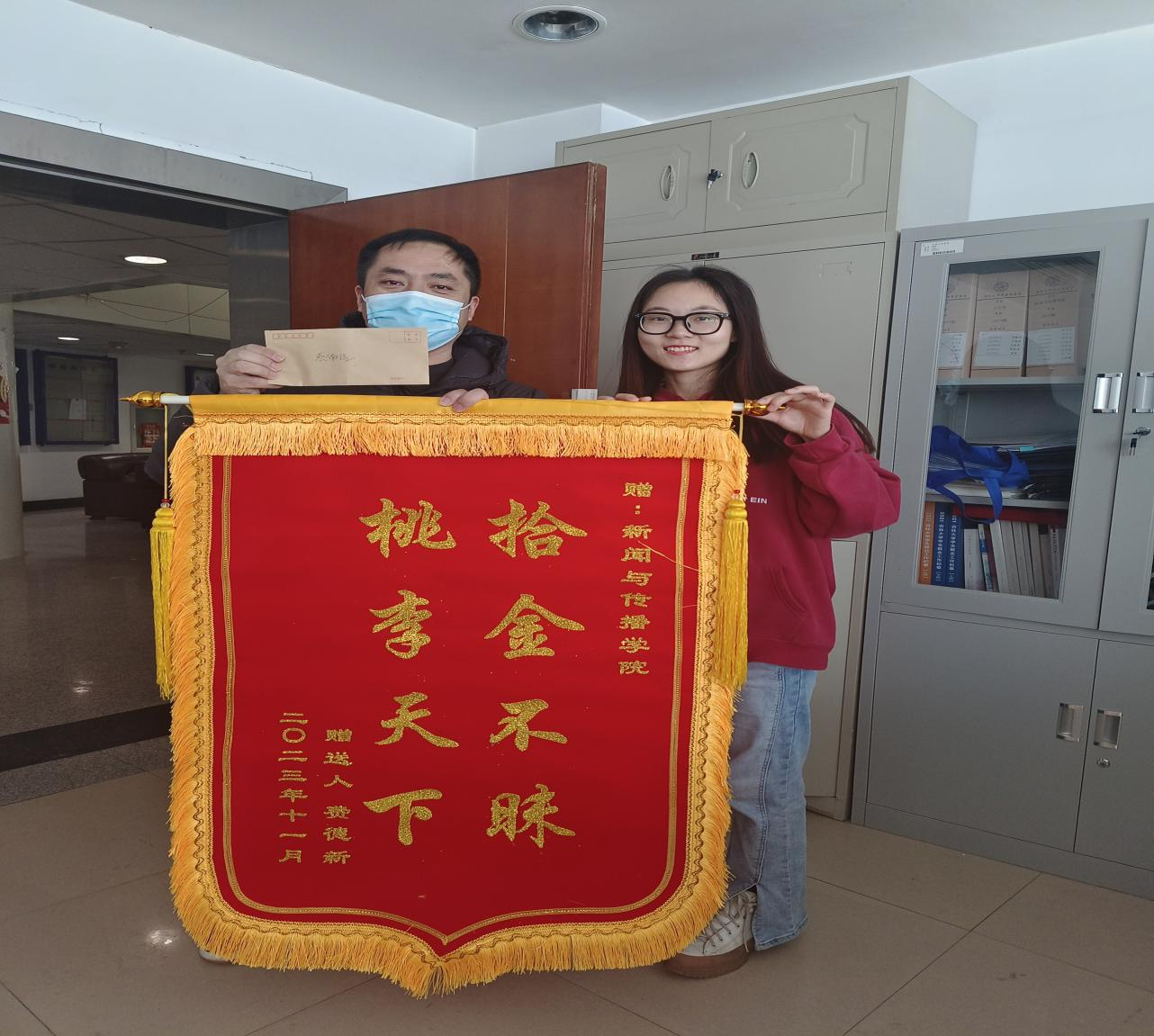 2023年11月25日,公司2021级新闻学专业刘邢同学在公司附近捡到一个装有银行卡、身份证、现金两千余元,各种票据数张的钱包。她第一时间用钱包中的名片联系到失主,将钱包归还。