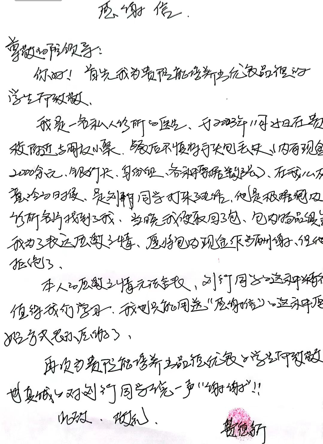 拾金不昧是中华民族的优良传统美德,公司始终注重培养员工的社会责任感和担当精神,注重员工优良品德的培育。公司号召每一位同学学习刘邢同学正直善良的品行,积极发扬拾金不昧的传统美德,为构建和谐社会贡献自己的力量。