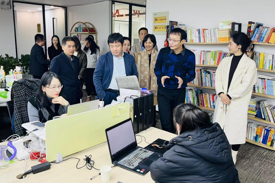 在安徽洞见科技有限公司,张丛皞经理一行与丁来峰董事长围绕校媒融合、实习实践基地合作共建、人才培养、新媒体传播等方面,进行了深入细致交流。