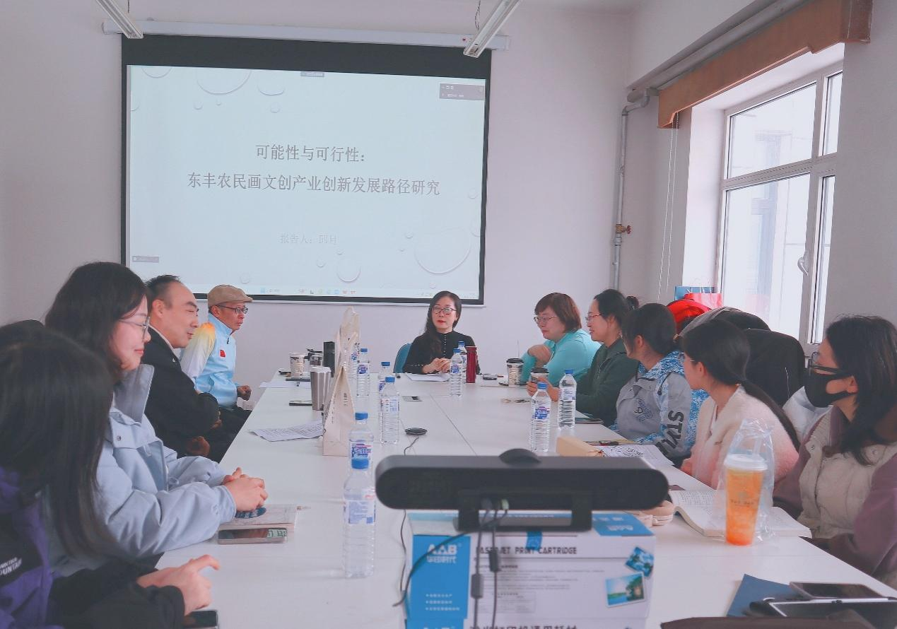 在评议与讨论环节中,王健副教授认为,报告从如何更好地开发民俗文化资源角度出发,提出农民画文创产业创新传播策略,针对东丰农民画产业化问题进行的探讨,对于践行当下乡村振兴的时代命题有着强烈的现实意义。邱月副教授进一步补充了农民画的国际化、特色化问题,农民画以画为媒,能够实现“讲好中国故事”,起到跨文化传播的作用。许多澍副教授认为,品牌化、产业化对农民画文创发展具有重要意义,邱月副教授的研究具有示范性意义。王志成副教授提出以专属超级符号为东丰农民画赋能,提质产业化效能和进程。赵贺副教授提出应当关注创作群体的可持续性和可创作力。与会员工针对学术报告的内容积极提问,师生就文创产业创新发展的未来之路、东丰农民画当下的传播困境,例如产业化和个性化的矛盾、版权问题、资金支持等问题进行了热烈讨论,在思想碰撞中延伸出课题研究新的增长点。