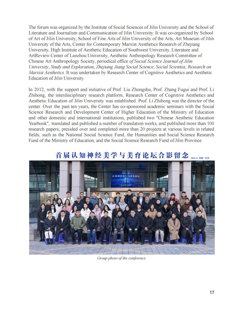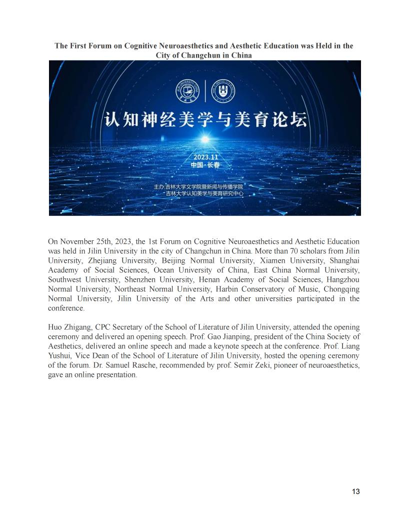 《通讯》对本次“认知神经美学与美育”论坛的报道,有助于国际美学界更好地了解我国当前“认知神经美学与美育”研究的最新发展动态与进展,有助于展现我国神经美学研究者的精神理念和风貌,有助于进一步开展美学研究的国际交流与合作。