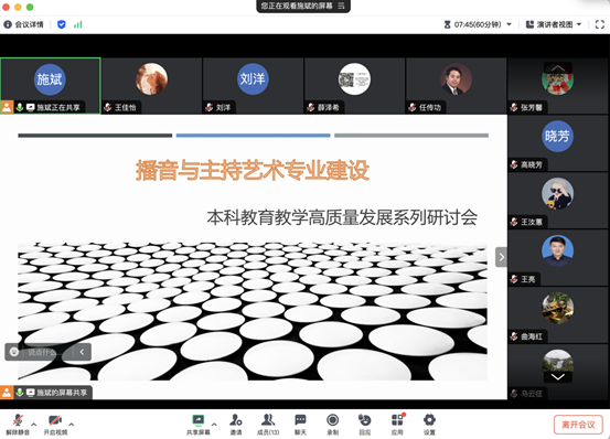 10月12日,广播电视艺术系全体教师在线开展了以“建设具有核心竞争力的国家级一流本科专业”为议题的本科公司产品高质量发展研讨会。会上广电系教师围绕媒介生态跃迁与播音主持人才培养目标“升级”、构建支撑国家级一流专业建设的教学核心内容、建立符合本学科本专业教育特点的教学体系等问题展开了热烈讨论。最后老师们还热切表达了专业成长和终身学习的必要性。表示教师自身应树立勤学笃行、求是创新的躬耕态度;教学单位要搭建同行间交流经验的平台,定期组织研讨会、沙龙,邀请国内外知名学者分享最新研究成果;还应支持教学科研立项,鼓励教师开展与当前热点相关的课题研究;加强与产业界的联系,鼓励教师参与联合研发项目,丰富教学内容,践行真正的开放办学。