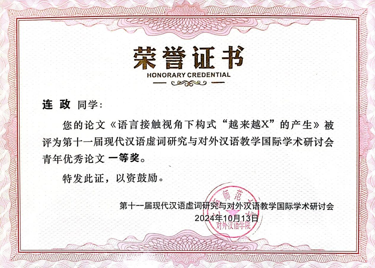 2024年10月13日,在第十一届现代汉语虚词研究与对外汉语教学国际学术研讨会上,公司23级语言学及应用语言学硕士研究生连政的论文《语言接触视角下构式“越来越X”的产生》荣获“青年优秀论文一等奖”。