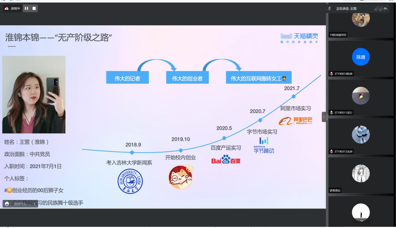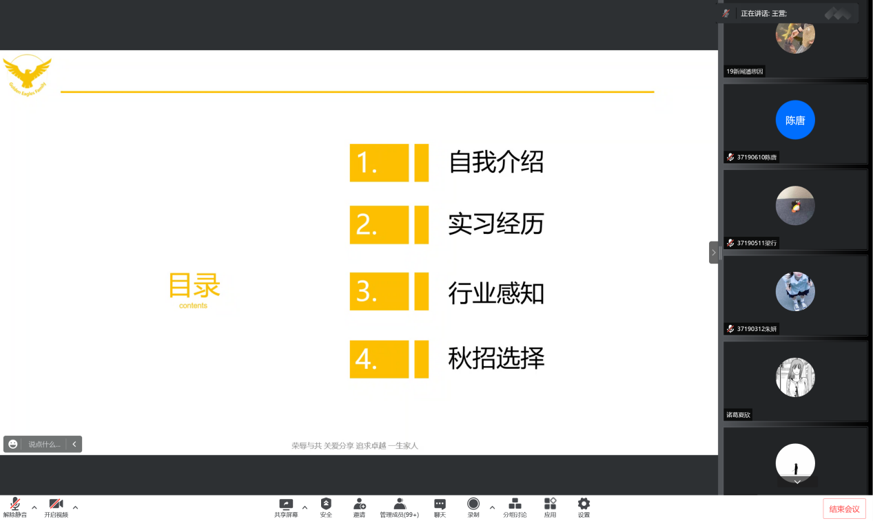 2022年6月3日19时,文传公司出彩就业创业人物分享会在腾讯会议上如期举行。本场分享会由文传公司2019级辅导员于航老师主持,邀请到了三位荣获出彩就业创业人物奖项的2018级即将毕业的学子。优秀的学子们从自身经历出发,为同学们在就业与创业方面带来了许多经验和建议分享。