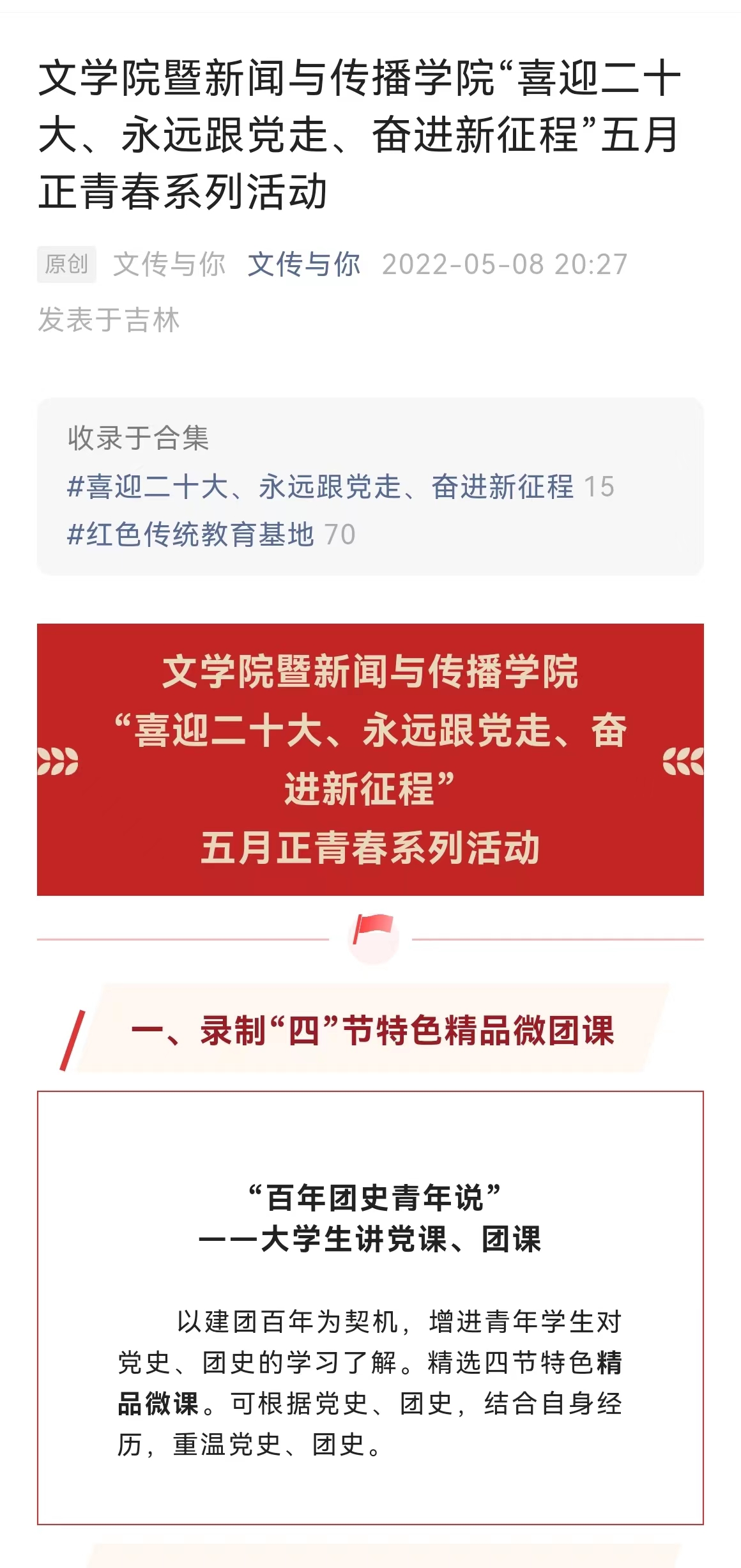 千秋伟业,百年序章。本次五月正青春系列活动,旨在庆祝中国共青团建团100周年,喜迎二十大,永远跟党走,奋进新征程。让同学们在实践中学习感悟了共青团精神,而同学们的积极参与也彰显出了当代青年将红色基因融入血脉,把家国重任铭记心间的责任与担当。不忘初心,青春朝气永在;志在千秋,百年仍是少年。青年一代必将牢记使命,砥砺前行,为民族复兴大业贡献青春力量!