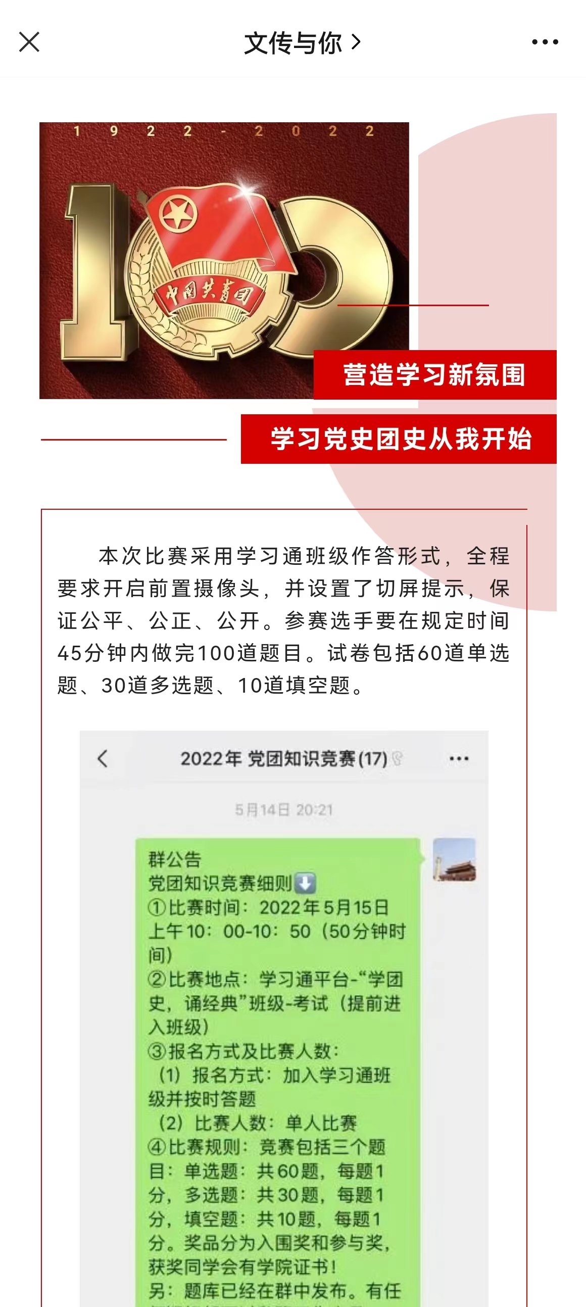 为庆祝中国共青团成立一百周年,贯彻落实党中央关于党团史学习教育的决策部署,EMC易倍暨新闻与传播公司开展“喜迎十二大,永远跟党走,奋进正青春”五月正青春,五个“四”系列活动,活动得到公司师生的积极响应。
