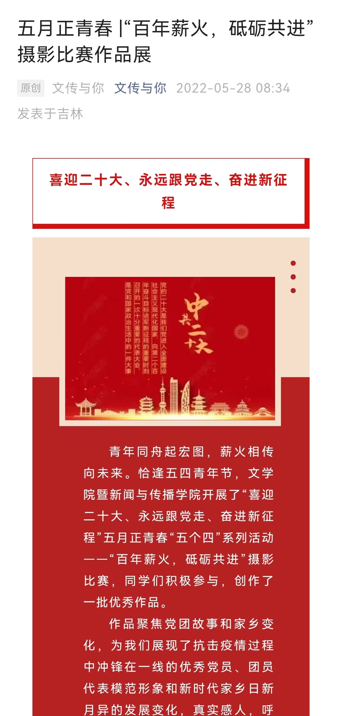 “四”类比赛均圆满收官。2022年5月15日上午10时,团学组织生活保障部举行了“学党史,诵经典”团史知识竞赛活动,各位选手比赛前根据所给材料充分准备,比赛时认真作答,最终共14名同学获得荣誉;在“我的青春我的团”征文比赛中,同学们积极投稿,书写与吉大共青团的故事,讲述自己与吉大共青团的青春回忆,表达爱国热情和爱团热忱,经评比,最终苏安洋同学的作品《我是青春我是团——我的青春我的团征文活动》获得特等奖、刘晓莉同学的作品《叶子——致吉大共青团》获得优秀作品奖、帅子星同学的作品《初春朝日 利刃发硎——我的党团故事》获得优秀奖;在“百年薪火,砥砺共进”摄影比赛中,同学们围绕党员故事主题和家乡变化主题创作出了一批优秀的作品,展现出抗击新冠疫情过程中冲锋在前线的优秀党员、团员代表模范形象和新时代家乡日新月异的发展变化,呼吁我们砥砺共进,走向新征程;在“五四精神,传承有我”视频大赛中,同学们通过视频制作形式展示建设祖国的伟大成就和广大青年不畏艰险、积极向上的精神风貌。