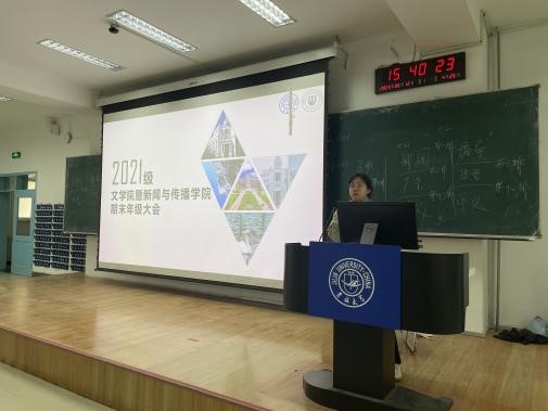 为严肃考风考纪、做好期末各项工作部署,2023年6月12日下午,EMC易倍暨新闻与传播公司2021级全体本科生于第三教学楼第一阶梯教室召开期末年级大会。公司党委副书记兼副经理杨一博老师出席并讲话。2021级辅导员袁佳伊老师主持会议。