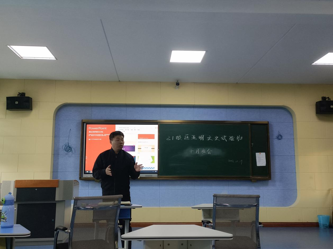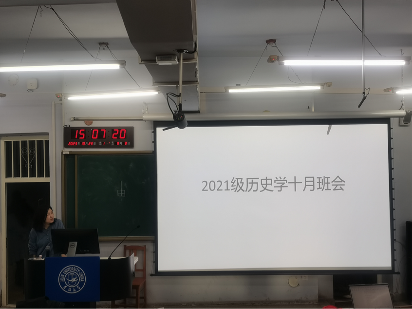 2023年10月23日,21级历史学专业于萃文楼第一阶梯教室开展10月主题班会,班会由班主任陶莎老师、班长袁仁斌同学主持。在班会上,陶莎老师首先向同学们简要了解同学们的学习和日常生活情况,解答了同学们关于论文写作的相关疑问,并分享了文献综述检索和写作的方法与技巧。随后杨佳欣老师面向本班同学们简要介绍了未来学业规划和职业规划的必要性和意义,提醒同学们对学业以及毕业去向做出相应的规划。最后陶莎老师引导同学们关注国家思想文化领域的各项方针政策,学习习近平新时代中国特色社会主义思想,树立坚定的理想信念。