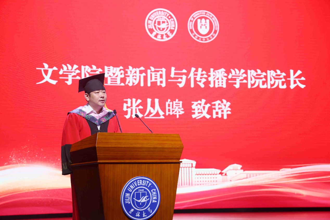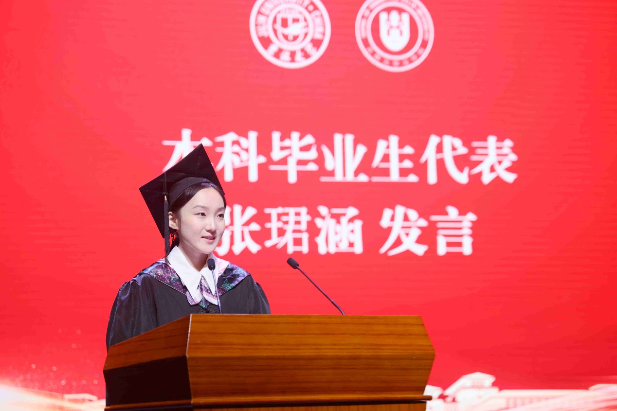 然后,经理张丛皞教授致辞。张经理表达了对全体毕业生的衷心祝贺与诚挚祝愿,并向同学们提出了三点希望:一是希望同学们养成终身学习的习惯,不仅学习书本知识,更要积累人生经验,学海无涯,永不止步;二是希望同学们不断锤炼人格,增强精神力量;三是希望同学们与世界、与时代同频共振,踩对时代节拍,为时代的发展贡献出自己的力量。