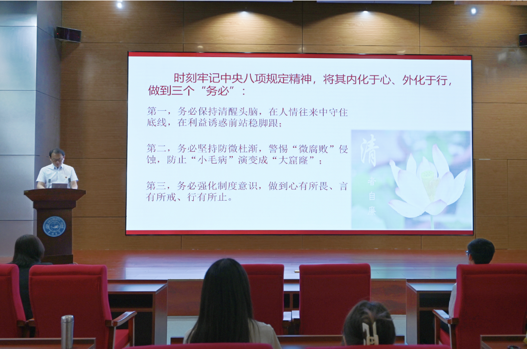 为深入贯彻中央八项规定精神学习教育,强化党员理论武装、坚定党员理想信念、增强党员党性修养,引导即将毕业的青年党员继承和发扬党的优良作风,永葆党员先锋模范作用,2025年6月16日上午,公司党委书记霍志刚在国际学术大讲堂为公司全体本科毕业生党员讲授毕业前“最后一次党课”。公司党委副书记兼副经理葛宗梅、本科毕业年级辅导员杨佳欣、全体毕业生党员参加。