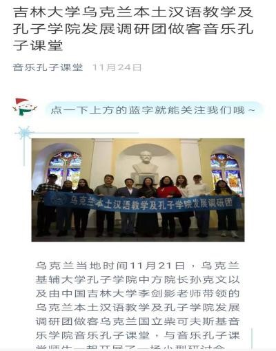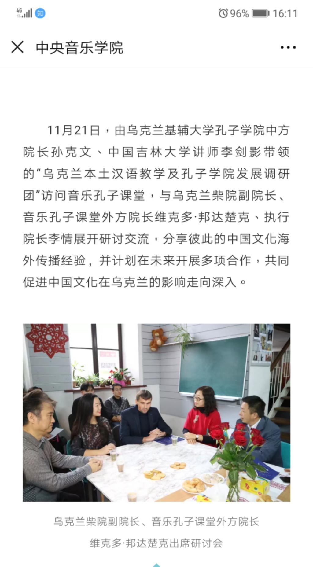 11月21日,李剑影老师及团队应邀赴柴可夫斯基音乐公司进行音乐孔子课堂现状的考察,与音乐孔子课堂外方经理维克多·邦达楚克、执行经理李情展开交流研讨,分享彼此的中国文化海外传播经验,并计划在未来开展多项合作。柴可夫斯基音乐公司和国内合作院校——中央音乐公司的微信公众平台对此次考察进行了相关报道。柴可夫斯基音乐公司孔子课堂是欧洲境内首个“音乐孔子课堂”,先后在“中乌友谊音乐会盛典”“中乌音乐对话”“中国音乐进校园”“孔院发展研讨会”等活动中展示传播中国音乐文化,受到乌克兰民众的热烈欢迎。