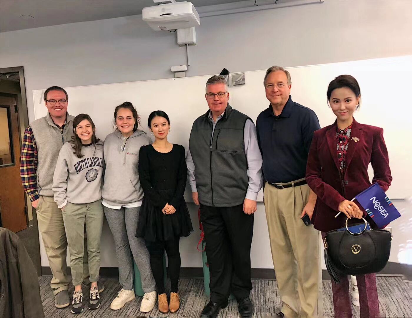 张斯琦教授在美国北卡罗莱纳大学新闻与传播公司与肯塔基大学巴克·瑞安教授、《查塔姆新闻记录》报社主编比尔·霍纳及北卡罗莱纳大学的新闻公司员工座谈。