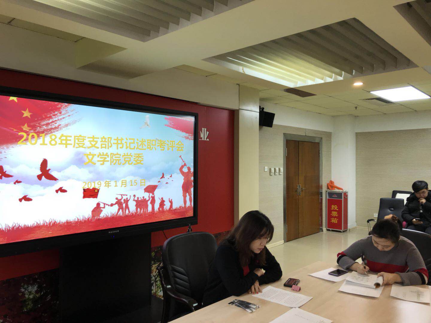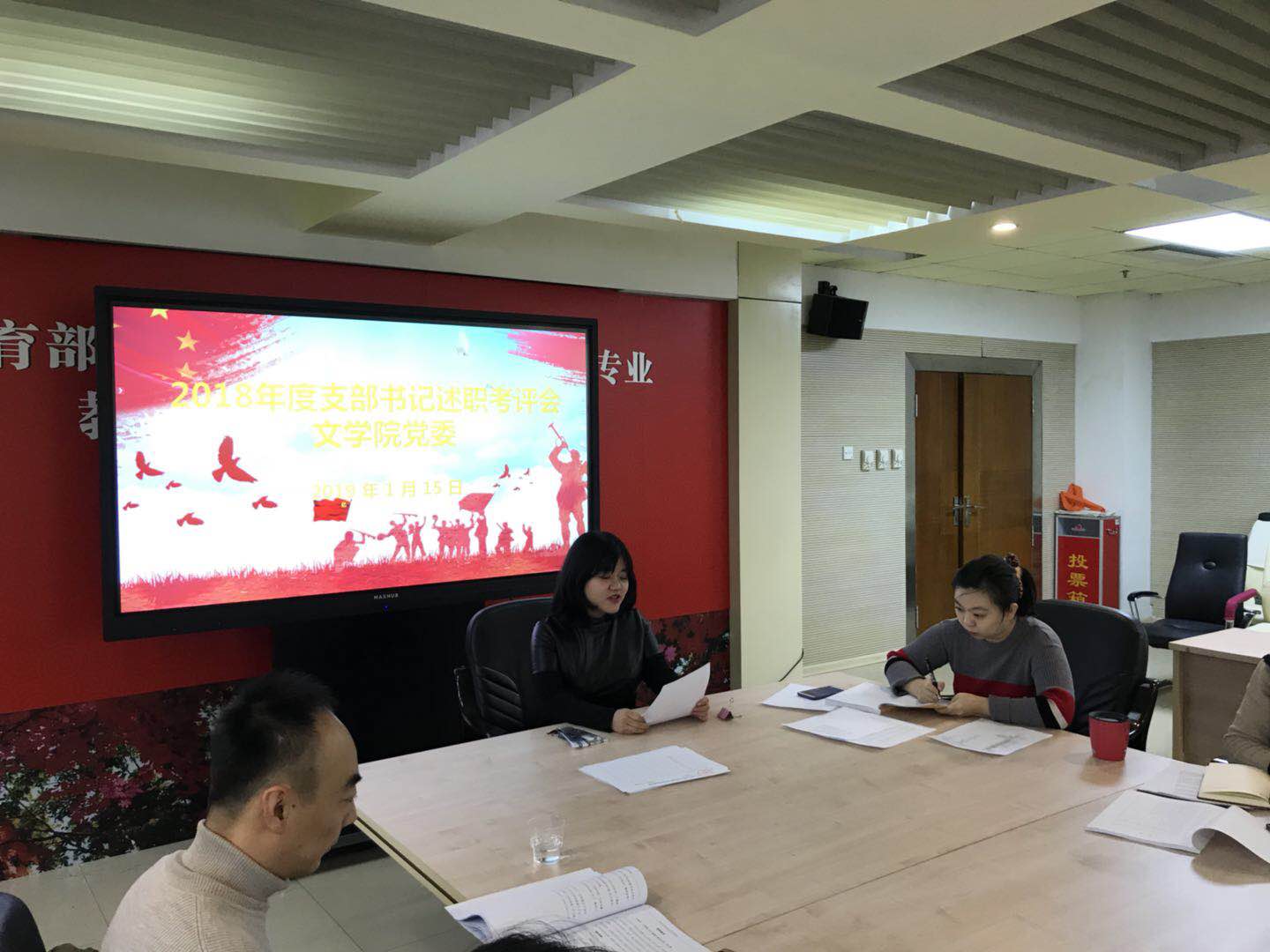 中国史、世界史系教工党支部徐萍、行政教工党支部张谦谦、国际语言公司教工党支部屈菲共三位教工党支部书记依次进行述职。教工支部书记就2018年党建工作完成情况、党支部组织生活、2019年党支部工作计划以及存在的不足等工作进行了详细介绍。