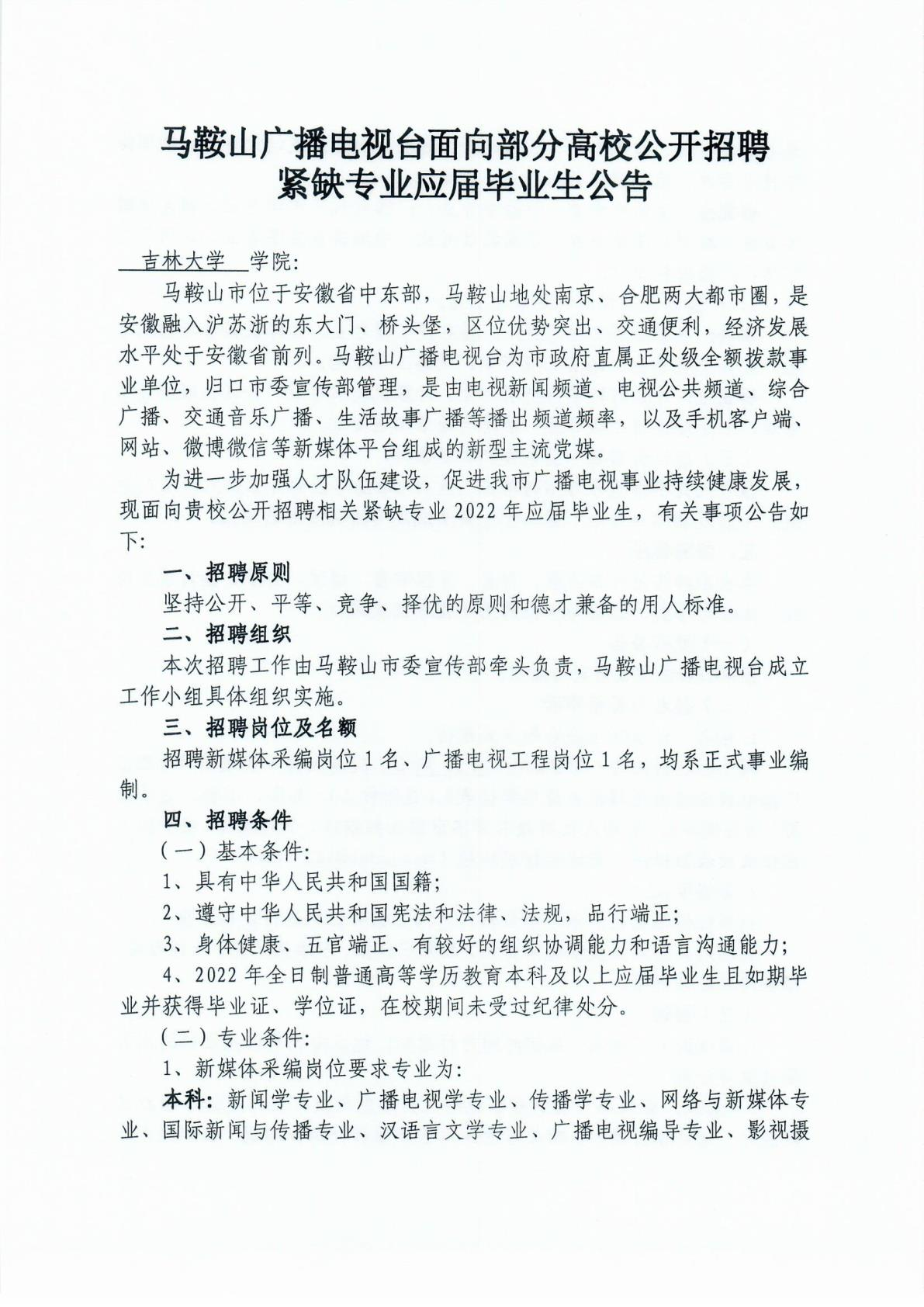 马鞍山广播电视台面向部分高校公开招聘紧缺专业应届毕业生公告