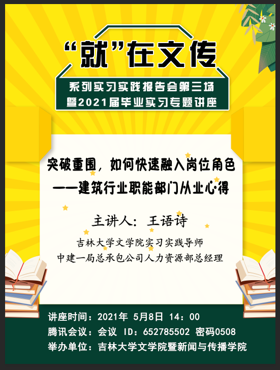 讲座题目:突破重围,如何快速融入岗位角色——建筑行业职能部门从业心得主讲人: 王语诗 EMC易倍实习实践导师 中建一局总承包公司人力资源部总经理